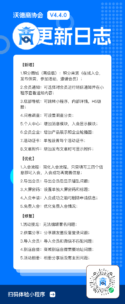 【新增】1.积分商城(高级版):积分来源(在线入会,发布供需,参加活动,邀请会员);2.会员通知:可选择对会员进行短信通知并在小程···